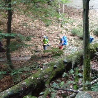 Die Gruppe der “Alpenüberquerung” der Montessorischule Chemnitz startete mittags vom Bahnhof in Chemnitz mit dem Zug nach Schmilka. In Schmilka angekommen, nutzen wir die Fähre über die Elbe, um zum Startpunkt der Tour zu gelangen. Nachdem die Trinkflaschen mit Quellwasser gefüllt wurden und die Gruppe im montessorischen Kreis nochmals über das Verhalten im Nationalpark aufmerksam gemacht wurde, begann der Aufstieg über die Heilige Stiege. Oben angekommen, wurde die Gruppe mit einer grandiosen Aussicht über die einzigartigen Felsen der sächsischen Schweiz belohnt. Der weitere Weg führte über den Frienstein ins Kirnitzschtal. Gegen 19 Uhr erreichte uns der Regen, der sich bereits durch viele dunkle Wolken angekündigt hatte. Wir hatten das Glück, dass wir kurz darauf die kleinen Boofen am Wildenstein erreichten und uns somit unterstellen konnten. Das Abendessen fand in kleinen Gruppen im Trockenen statt und schmeckte nach der körperlichen Ertüchtigung von 300 Höhenmeter Aufstieg köstlich. Eine kleine Gruppe stieg nach dem Essen nochmal hinab ins Tal zu einer Quelle und befüllte Wassersäcke, um die Trinkvorräte aufzufüllen und die Versorgung mit Tee am nächsten Morgen vorzubereiten. Dann begann eine spannende Nachtruhe im Freien, in der es hin und wieder an verschiedenen Stellen im Wald raschelte und knackte.